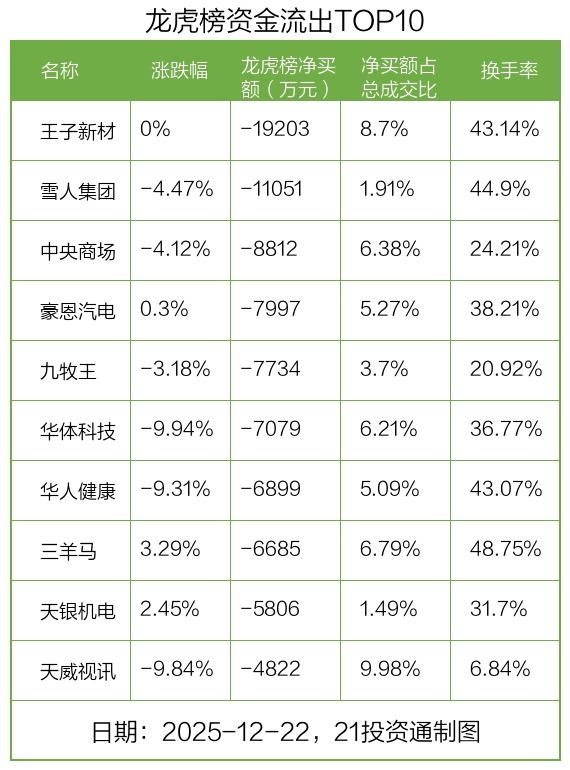 而龙虎榜中资金净流出最多的是王子新材(002735.SZ),被净卖出为1.92亿元,占总成交金额的8.7%。王子新材收盘下落0%,换手率为43.14%。