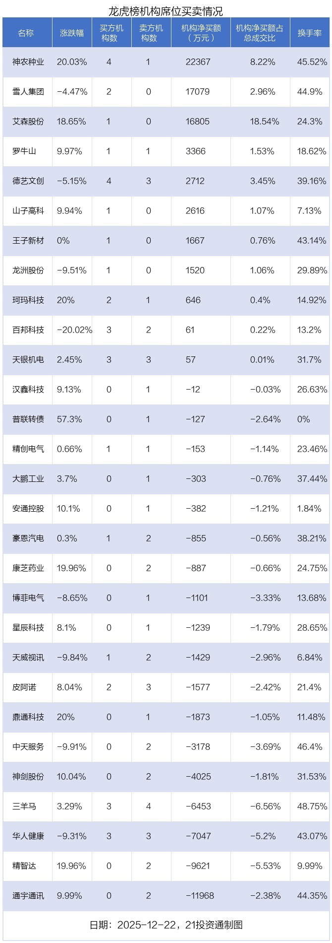 其中,机构净买入金额最多的是神农种业(300189.SZ),当日收盘高涨20.03%,换手率为45.52%。
