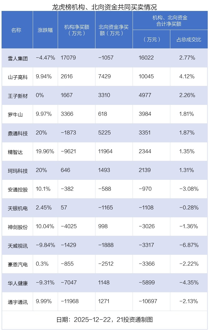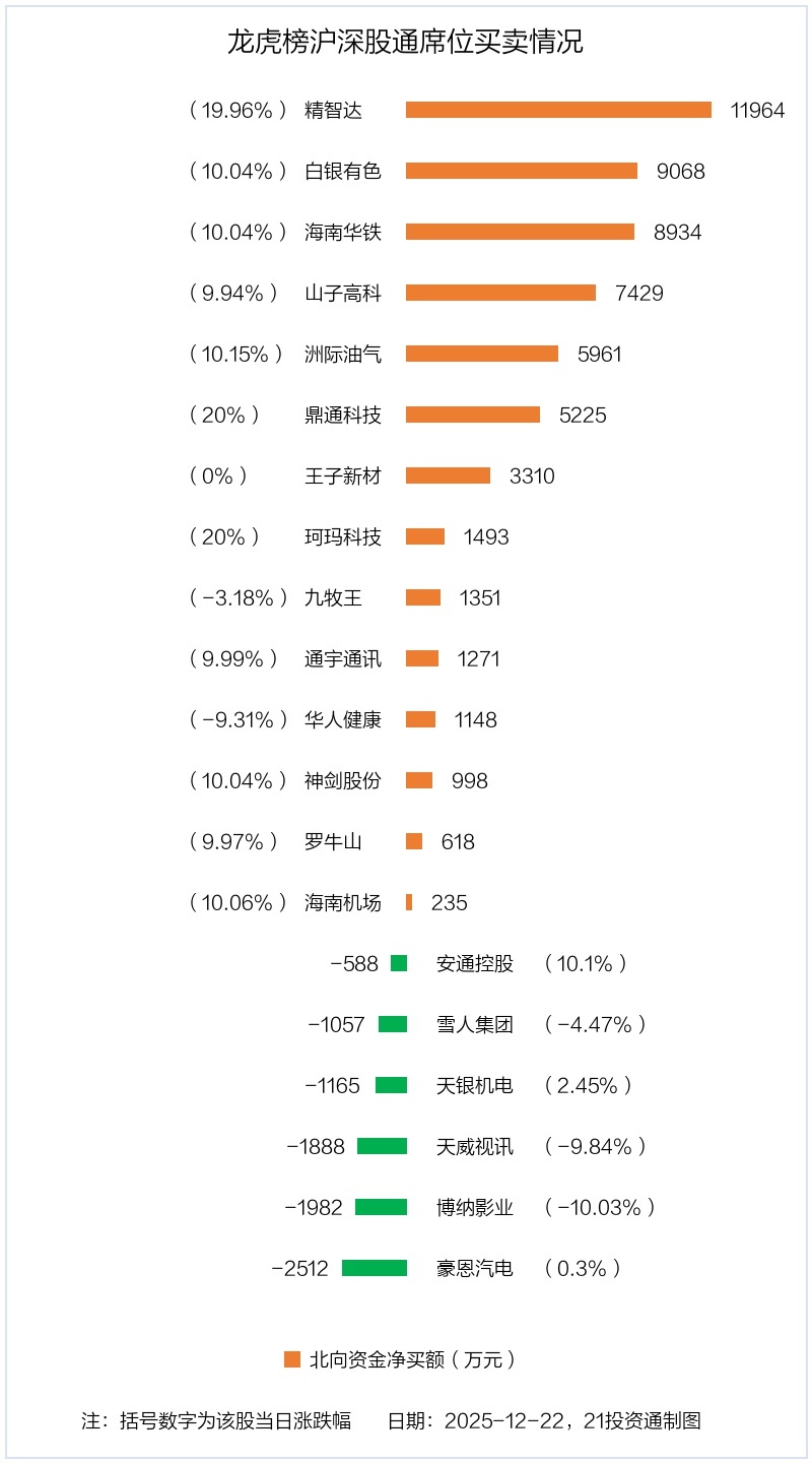 12月22日,北向资金参与龙虎榜中的个股共有20只,悉数净买入4.98亿元。其中沪股通净买入7 股,净卖出1 股,悉数净买入4.22亿元;深股通净买入7 股,净卖出5 股,悉数净买入7662.56万元。