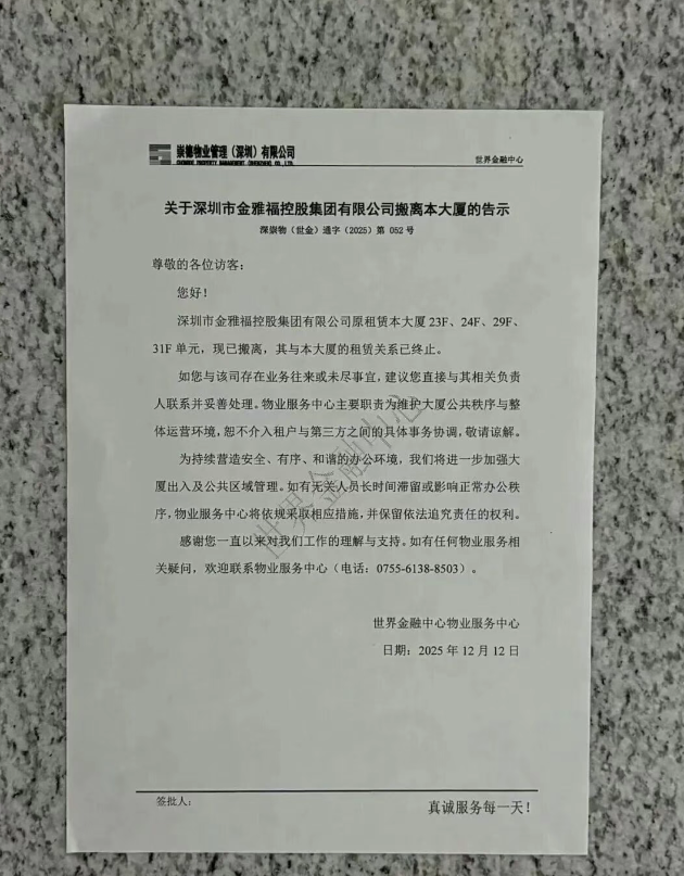 记者看到,相关楼层多处张贴有该大厦物业公司公告,称金雅福原租出该大厦23F、24F、29F、31F单位,现已搬离,其与该大厦的租出关系已绝交。公告签发日历为2025年12月12日。