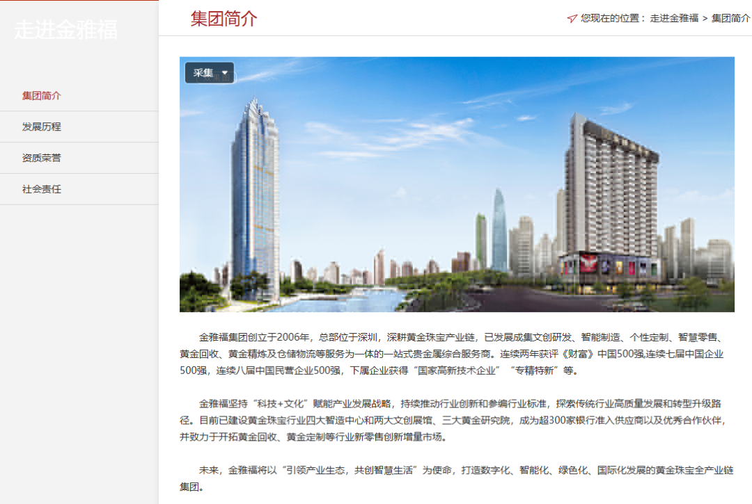 据公司官网,金雅福创立于2006年,总部位于深圳,深耕黄金珠宝产业链,已发展成集文创研发、智能制造、个性定制、聪惠零卖、黄金回收、黄金精熟及仓储物流等处事为一体的一站式贵金属玄虚处事商。