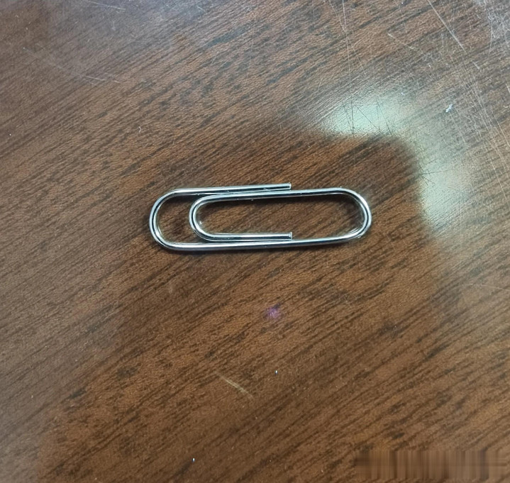 样本图片知晓,曲别针被置于深色木质桌面中央(反光率约35%),周围无其他物品——这种“稳固存在”揭示了其在办公空间中的“边缘化中心性”: