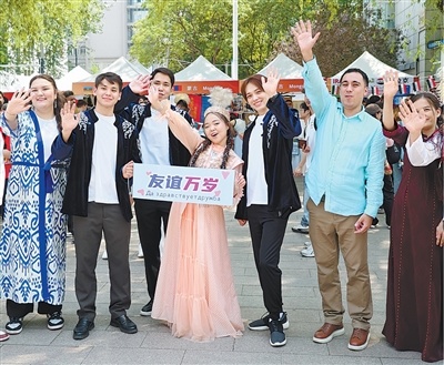 5月26日,中国石油大学(北京)第八届国际文化节在北京举行,中亚多国来华留学生建树国度文化及好意思食展台。图为中亚留学生在活动上合影眷恋。