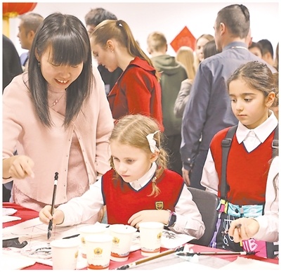 “同庆中国年 感受中国风”活动2月在俄罗斯莫斯科剑桥国际学校举行。图为该校学生在淳厚携带下体验中国书道。